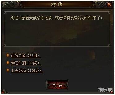 打开绝地系统,可以看到,绝地共分为:“百妖书殿”、“陨石矿洞”、“上古战场”三个部分,只有达到等级要求的角色,才能进入。