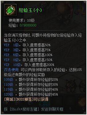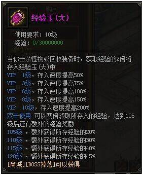 可以通过击杀BOSS获得,也可以直接在商城购买,当背包中放有经验玉以后,在日常打怪的过程中,会有相当于击杀怪物2倍的经验存入经验玉中,在回收装备的过程中,也会将回收装备的2倍经验存入经验玉中,当经验玉存满经验后,在游戏正下方会出现“EXP”图标,提示您可以使用经验玉,