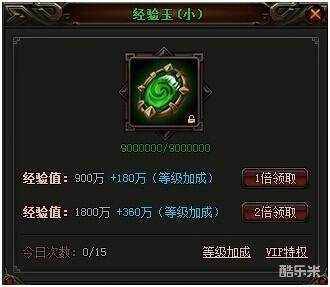 当经验玉存满经验后,双击即可使用,您可以选择免费的“1倍领取”也可以选择花费元宝“2倍领取”,当等级提高后还可以获得额外的经验加成。