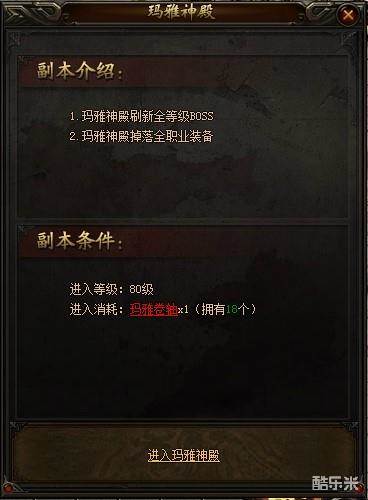 想要进入神殿必须要消耗玛雅卷轴,神殿内有全等级BOSS,掉落全职业所有装备。