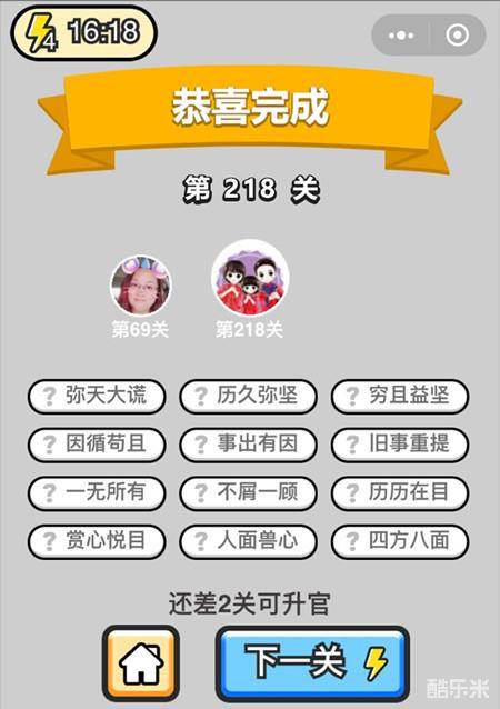 《成语升官记》探花第218关中只有一个成语相对来说不是那么熟悉的,当然因为其他成语还是相对比较熟悉的,所以这一关也没有多大的难度,下面就是小编为大家整理的答案~
