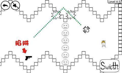 5、看到手枪千万不要拿,前方的一排怪物不要理他们,直接飞上他们左上方的砖头撞开,越过他们之后在撞开另一边的墙,即可过关。