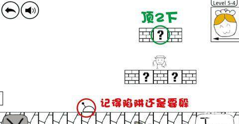 4、来到第二个“?”号位置停下,顶出毒药,这个时候会看到一个怪物,此时怪物的跳跃是根据你的操作而动,我们要做的是让其避开这瓶毒药,等待合适的时机让怪物避开毒药并且让其跳上一层平台之上。继续等待怪物走到平台的左端,让他起跳,这样他就不会触发前面的地刺陷阱。