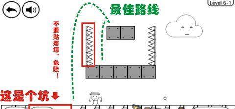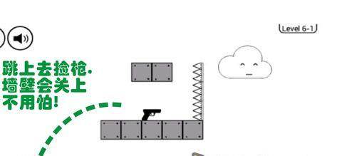 开始直接将道具“手枪”吃掉,之后两边升起尖刺,跳跃至高台上之后,往左回跳至地面,注意这里不要跳的过猛,后面的地面是陷阱。