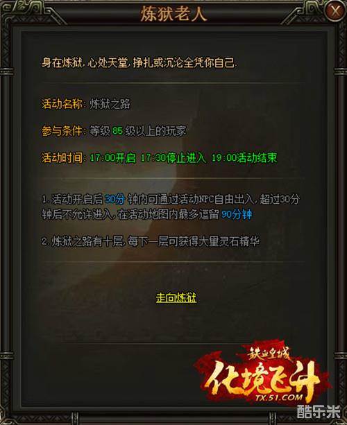 51《铁血皇城》炼狱之路活动开启,玩家在每天的17:00-17:30找到NPC炼狱老人就可以开始炼狱之路,活动开启后30分钟内可通过NPC自由出入,在活动地图内最多逗留90分钟,炼狱之路有十层,每下一层可获得大量灵石精华。