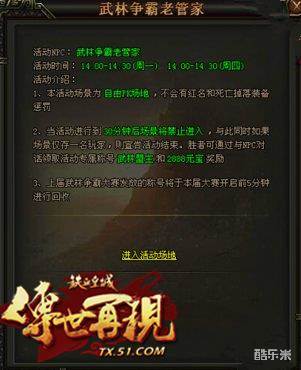 既然刚刚说到了皇城争霸那么想要成为武林盟主的小伙伴一定不会放过这个好机会的,在这个活动中场景仅剩一名玩家的时候活动就会结束了,胜利者可通过与NPC对话领取活动的专属称号武林盟主以及2888元宝奖励。