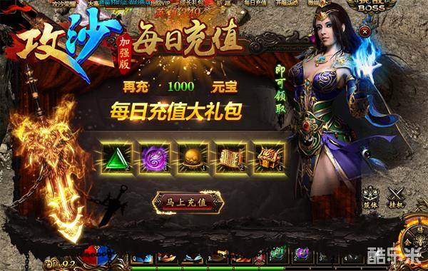 《攻沙》里的充值比是1:100,得到元宝之后,便可在商城购买所需要的物品。如果想要成为最厉害的玩家,不用花多,每日充值10元(不到一顿饭钱),将每日充值的大礼包领来,就可以得到最多的好处了。