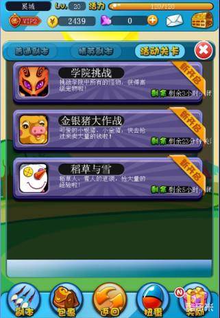 活动副本分为三个部分,第一个是“学院挑战”,玩家可以通过这个副本挑战学院中所有的怪物,获得高级宠物!这是玩家获得大量宠物的最好途径,当然,奖励越好的副本,所消耗的体力也越多,活动副本所消耗的体力几乎是普通副本的十倍。而第二个“金银猪大作战”,副本描述是“可爱的小银猪、小金猪,快去抢来卖大量的钱啦!”,正如描述所说,这个副本是玩家最重要的金钱来源,缺钱的时候一定要去扫荡哦!第三个则是“稻草与雪人”,这个副本则是奖励大量经验的地方,玩家可以从中获得高级食物来喂养宠物,让宠物得到最好的强化。