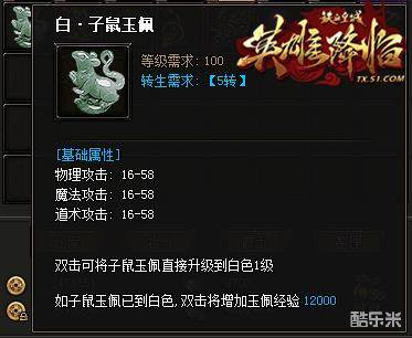 上图便是“子鼠”,而击杀之后便会掉落“子鼠玉佩”,其属性便是增加攻击力,玉佩还分为白色,绿色,蓝色,紫色,橙色,成色越好,加的属性就越高!