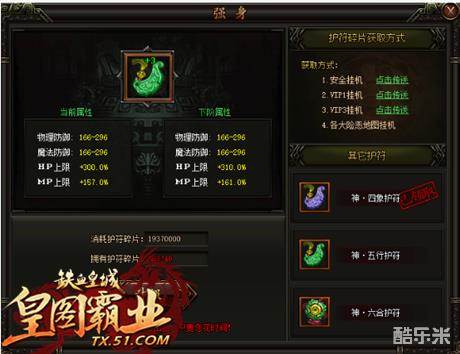 升级血符需要护符碎片,护符碎片无法购买,能通过挂机获得,在VI1、VIP3、VIP6、VIP8以及各大凶险地图挂机获得,VIP地图安全可靠,等级越高的VIP地图越高护符碎片以及经验收益越大。