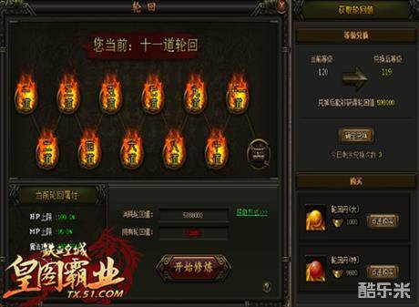 进入轮回道击杀强大BOSS和怪物,获得大量的经验和轮回装备!轮回装备分为二、四、六、八、十以及十二道轮回装备,获得比普通装备更强大的属性装备,轮回装备有专属的装备栏,意味着人物属性将得到极高的提升。