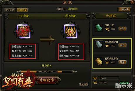 成就积分可以用来提升勋章等级,勋章提供大量的自身攻击数额,相比于其他的提升战力的系统,勋章的性价比是最高的,可以直接获得大量攻击。成就勋章共计分为15个等级,在提升自身等级与转生时同时会获得可观的属性加成(另外获得成就积分的地方可以在商城购买成就令牌,可以大大增加提升的速度)-