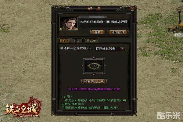 在萌乐网《铁血皇城》当中,打开好友列表即可选择一名好友进行结义。与兄弟结义即可免费领取情义之戒。结义之后,每在线一小时即可领取200亲密度,每天最多可以领取1000点亲密度。而亲密度可以用来提升戒指的等级,让自己战力快速提升,真正做到与兄弟共同成长。
