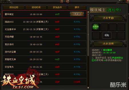 游戏中每天的固定活动都要参加,有些奖励元宝,有些奖励加战力的称号,有些奖励我们所需的材料等。是个提升战力不错的选择。我们的绑定元宝可以积累下来,在出节日活动或百服活动时,可适当刷新神秘商店,去购买一些绑定元宝和金币可购买的物品材料,提升战力。活动神兽BOSS必掉元宝和6转装备,一定一定要参加。合区后的神兽也要参加,必掉一件铁血四件套。