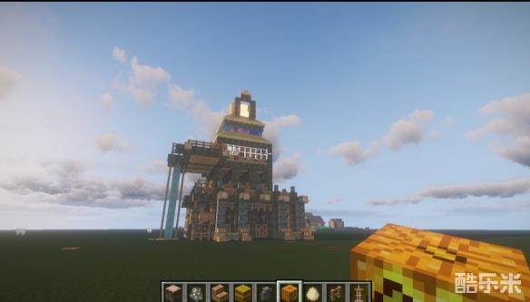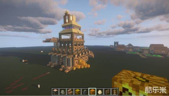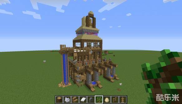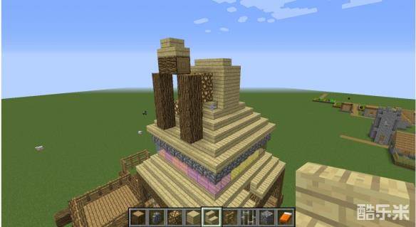 13用阶梯搭好最高的屋顶之后,用橡木,萤石与阶梯搭出如图装饰。(科普时间到啦!这也是中世纪建筑常用装饰方法,大家可以将其加高或多做几层,也可以将其应用在其他的建筑上哦~)