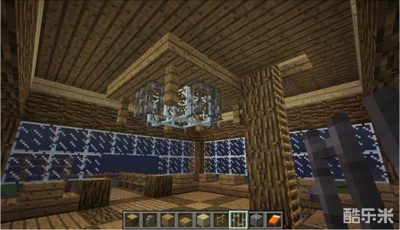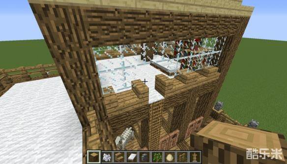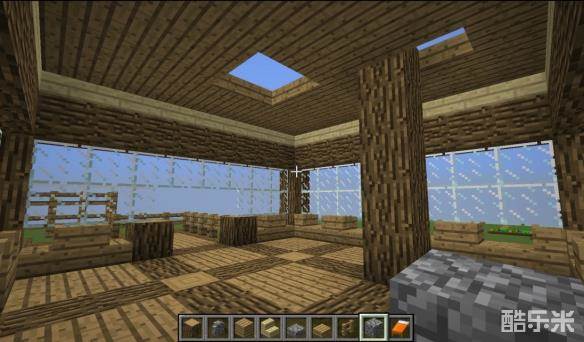 9在屋内如图建立橡木柱子与打一个2x2的孔供下一步添加屋内物品与装饰使用。