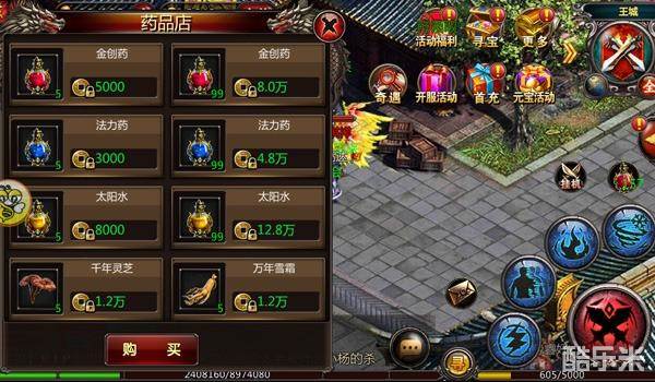 小编是一个贫民角色,49级时候战力不够一万,同时怪物伤害非常高,注定这是一场消耗战,所以加血金创药品必不可少,购买两捆198个,然后把药装备到挂机按钮旁边位置。