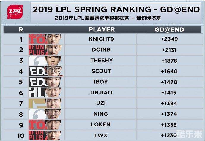 英雄联盟LPL场均经济差前10名:Knight排第一 Doinb紧随其后
