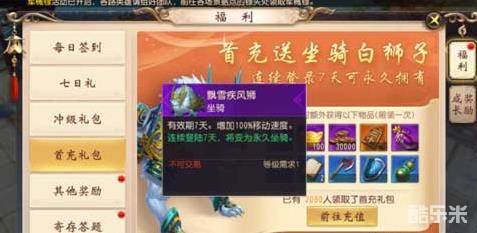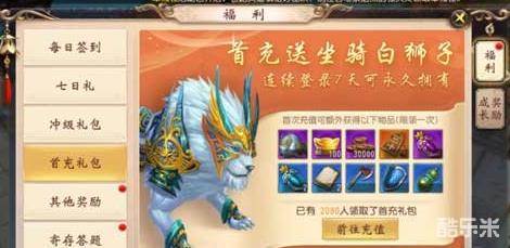 在设定中,白狮子的获取方式,就是首充礼包,首次充值之后就可以获得充值礼包,里面就有白狮子这个坐骑。不过是有期限的,只有7天。但是玩家在连续登陆7天就可以将这期限的白狮子升级成永久的,下面,就和大家介绍一下这个白狮子的属性。