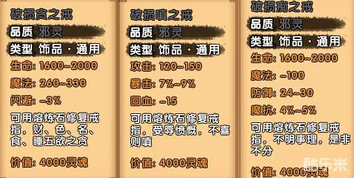 上面是三个戒指的属性。这些戒指还是破损的,属性不稳定也没有buff效果,不太好用,建议用两个熔炼石合成完整戒指。