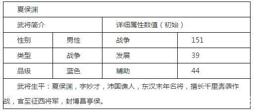 总而言之,夏侯渊做为蓝色武将,获取还是较为容易的,用其驻防城墙,守护主公的城池是一个非常不错的选择,相信各位主公一定会需要这样一位将领的。