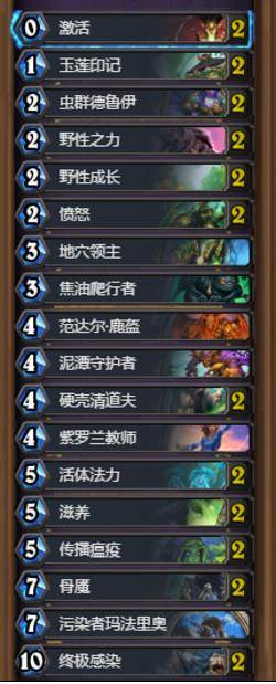 前中期以场面为主,跳费的目的也是为了更好的铺场,除了低费的单卡外,活体法力和传播瘟疫也是很强的铺场卡,同时配合玉莲印记和野性之力可以很好的站住场。