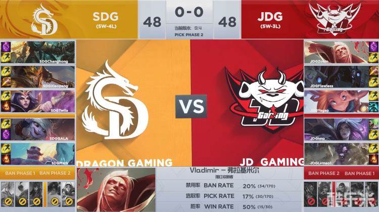 比赛的第二局,双方再度选出与第一局结构相似的阵容,SDG在后期的制造伤害能力更强一些,比赛开始双方打野常规开。