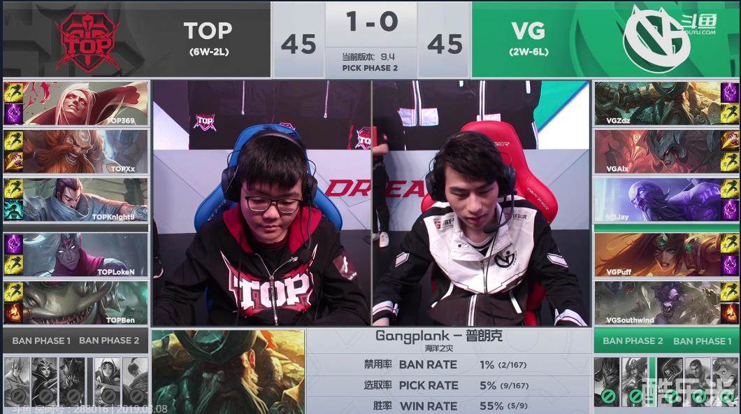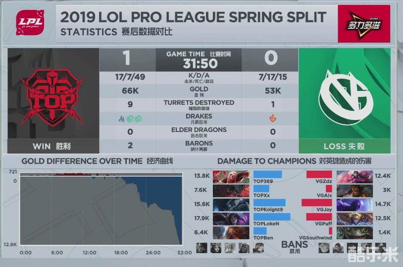 TOP是一套比较偏发育的阵容,而VG是打前中期节奏为主,比赛开始双方打野常规开局。比赛的前期,双方均是稳住线上发育,TOP通过优秀的野辅联动游走,快速的帮助TOP拿到节奏的领先,前期取得优势。比赛的中期,双方仍是节奏比较缓慢,TOP更好的抓住了机会,在22分钟的野区开团将VG三人击杀,随后轻松拿下大龙。之后,TOP虽然有着一波上头的越塔与VG进行了一波人头互换,大龙推进节奏被阻断,但TOP仍手握进攻节奏的领先锁定胜局。最终,TOP再度拿下大龙团灭VG,强势中路推进赢下首局。