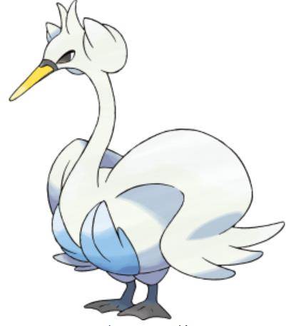 这个PM的设计灵感很明显来自于丑小鸭变天鹅的经典故事,只是……这个天鹅我觉得还没丑小鸭好看,做交通工具我都不给它进化的,这个画风实在太……类似前面姨妈了,尤其这个健壮胸肌特性实在让人浮想联翩,考虑到1:1的性别比的话。作为水飞存在感比其他几只要弱多了,鲤鱼飞鱼甚至同病相怜的大嘴鸥都在七代得到了翻身,而天鹅却仍然只能抱着这个优秀的属性组合坐板凳。这和其坑爹的种族分布有不少关系,在大部分作品中都是以优雅法师形象处境的天鹅在PM里就变成了一个一言不合开冲锋的双修战士,有强壮的胸肌却是个脆皮,速度是水飞里最快但没有龙舞上限不高。这个双攻速能再各提个10点的话也还是可以接受的双刀种族,只不过天鹅的技能池能提供的支持也非常有限,所以要翻身的话,Mega是必不可少的捷径(最好有力度修正的特性),或者补加比较强的强化技能。至于现在,这三个特性看着都是白板,感觉都没啥选择空间,用雨天就湿身吧,一般情况下真没太大区别。