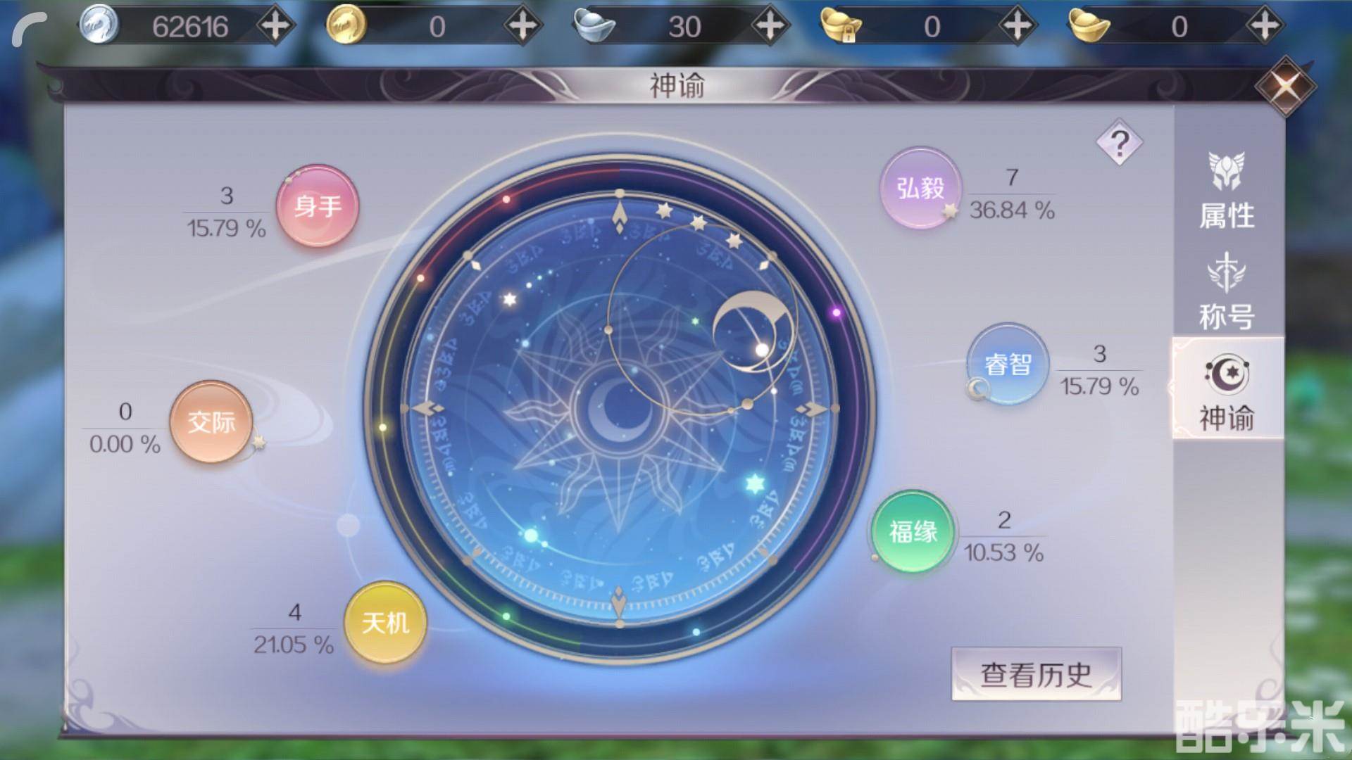 首先神谕还是有六种神谕的,它有身手、交际、天机、弘毅、睿智、福缘,这六种神谕玩家可以提升属性,获得特殊的爆率加成。
