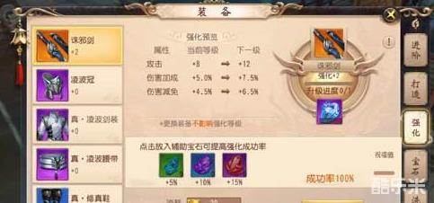 我们在装备栏目中,就可以看到强化这项功能。可以看到强化到下个等级的效果,强化所需的材料以及强化的成功率。在游戏的设定中,更换装备不会影响强化等级,也就是有了装备之后就可以尽情强化,换了装备之后还是这个强化效果。