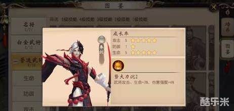 接着就是奉剑,奉剑的外形是非常的炫酷的,光颜值就值得入手。奉剑的攻击成长率也较高,培养起来比较快。奉剑的技能势大力沉2,可以是武将攻击、生命+3%,伤害强度+4%,很大程度上提升了奉剑的伤害。