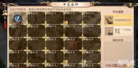 在平定安邦的图上,问号和感叹号的地图,可以触发任务,获得道具奖励等。平定安邦的经验奖励很多,可以帮助玩家快速的升级。而平定安邦的全图奖励,就是指将地图全部点亮。奖励一个飞鞋,可以0行军点飞往任意城市,务必珍惜使用。