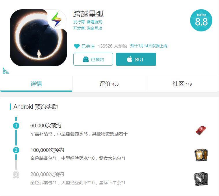 在TapTap参与《跨越星弧》手游预约,除了给为每一位玩家送上开服大礼包,更是设定了阶段预约目标,从6万、10万,到最终的20万,每达成一个预约目标,都会解锁更加丰厚珍贵的奖励,助你光速升级,福利叠加爽翻天。