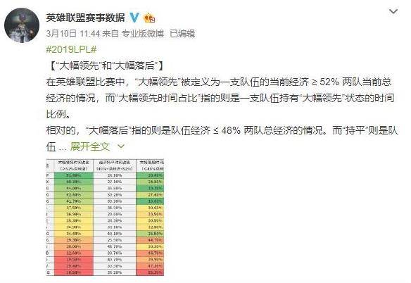 每次的LPL职业比赛中,解说们都会介绍一个官方赛事微博,也就是英雄联盟赛事数据。这是官方的一个赛事数据微博,虽然关注的人不多,但胜在数据真实可靠,所以体现的东西也更加值得研究和探讨!这个官博最近发了一个关于经济”大幅领先“和”大幅落后“的时间占比数据,意在体现战队终结比赛的能力,我们且从赛事数据看真相!