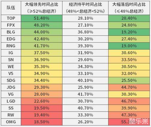 有的队伍终结比赛能力强,而有的队伍韧性强。在经济大幅领先时间占比的排名中,RNG排到第五,这个排名确实不算高。但让人惊讶的是,RNG的经济持平时间占比非常高,39%几乎是联赛前几名,而最让笔者意外的是,RNG的经济大幅落后时间占比只有19%,排在联赛第一名,第二名是BLG。