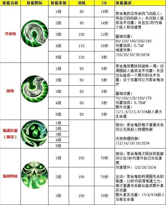 在刀塔西游中索命鬼属于偷袭英雄,前期尽量在地图中打野怪和不断的游走偷袭各路敌人,如果发现落单的敌人,释放夺命钩冲向敌人,然后释放旋钩进一步输出敌人,最后开启冤神附体与队友合力击杀敌人。注:团队战斗时索命鬼不要急着进入战场,否则容易被敌人合力击杀。