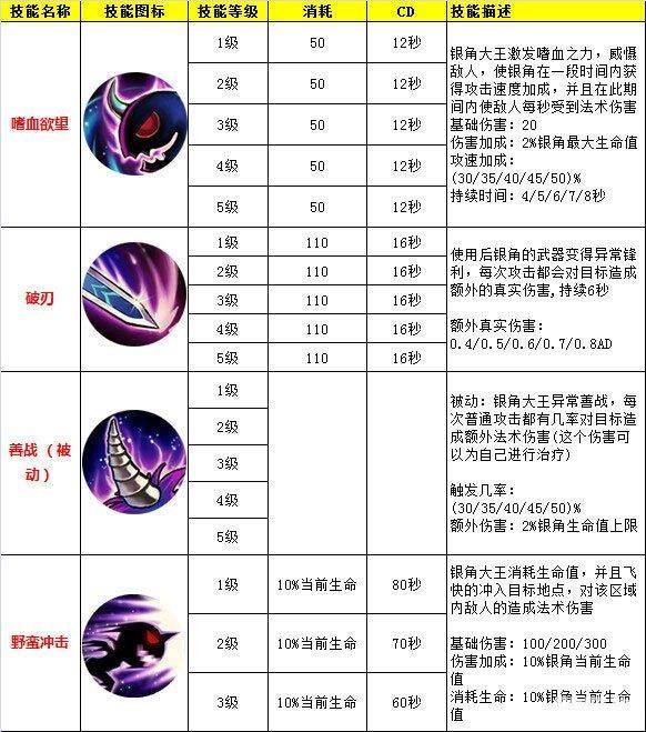 在刀塔西游中银角大王的单打能力很强,但团队作战能力略微薄弱。单打的时候要快速开启破刃和嗜血欲望,让自己的普通攻击能在短时间内达到最高伤害。如果敌人逃跑则开启野蛮冲击减速敌人再次进行普通攻击。打团战时不要先进入战场,待团战打的差不多,对方输出英雄把技能都放了,再开启野蛮冲击突入战场进行输出。