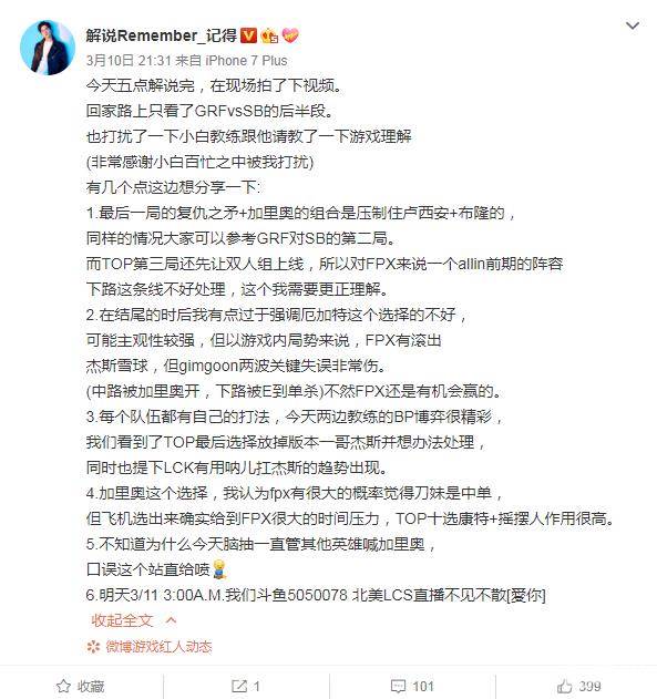 整篇微博也是总结了自己的问题,主要是游戏理解出现偏差,还有主观性太强导致解说出现问题。更是频频出现口误,将其他英雄叫成加里奥。