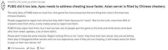 最后编辑于6年前不久前,Respawn曾在游戏公告中表示已经通过反作弊系统封禁了《Apex英雄》里超35.5万名外挂玩家,并在PC端新增了举报功能。可这些数据和措施并未让玩家感到满意,近日,在Reddit论坛上,一位外国玩家发起的关于对中国区玩家进行锁区的言论,引发了广泛讨论。