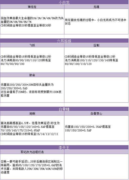 小白龙的[神龙柱]在团战中也是BUG存在――满级10秒恢复50%的血量着实恐怖,但是现在这恢复失血量的比例似乎是削弱得太过分了,可以说这个技能几乎已经废了――只在特定的时候适用,但回复量又比不上从前;而大招也同样被削――原本的无敌改做无法被选定,也就是说AOE伤害不能免疫。不过大招只要不是残血时释放其实问题不大,毕竟伤害摆在那里。但是我觉得这一次小白龙的改变其实都不合理――W技能直接废掉,大招改得无足轻重(大招一般不会在多人时释放,所以不会有承受大量伤害的时候)。