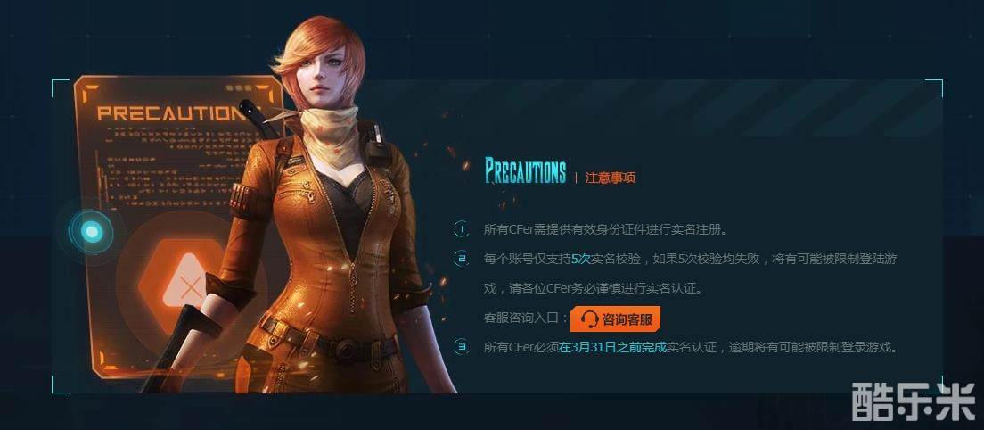 根据2010年8月1日实施的《网络游戏管理暂行办法》,网络游戏用户需使用有效身份证件进行实名注册。实名信息将会判断是否纳入防沉迷系统之用,如果未进行实名认证,可能会对以后的游戏体验有所影响,所以各位CFer一定要按时认证,认证成功的用户是可以在活动中领取奖励的。