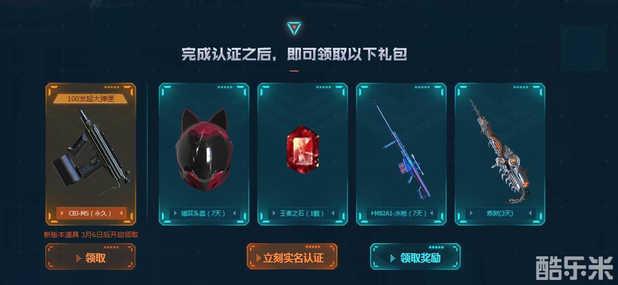 目前这个活动只可以通过电脑客户端打开,所以小伙伴们需要到官网进行认证,实名认证成功后的用户可以领取以下礼包:猫耳头盔(7天)、王者之石(1颗)、M82A1-水枪(7天)、炼狱(3天)以及本次活动的主角全新外服神器-CBJ-M3(永久),一把外服引进的冲锋枪。在3月6日版本更新后即可领取永久版本,其余4款道具可以在活动有效期内随时领取!(无论你是否有防沉迷,只要完成实名认证,就可以领取以上的奖励!)