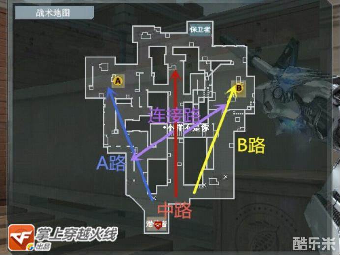 这个站位不管是哪个口进来或者两个口同时进来,都能做到万无一失,当然在A二层小道也是需要防范的,所以站在相比较横栏上的协防,站在窗口上的位置,更能有利于防守,因为这样可以同时防守A小道的敌人来犯。