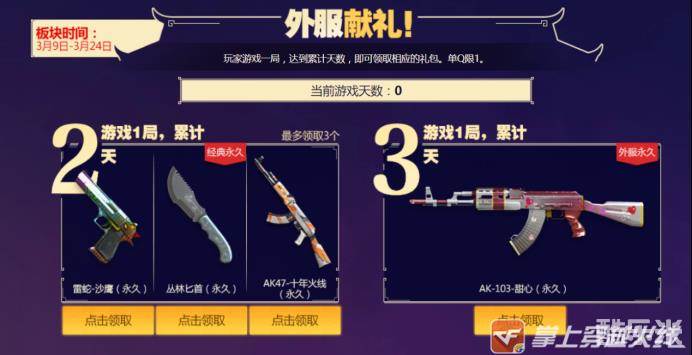 当然了,对于很多小伙伴而言,还是永久期限的武器道具更具吸引力。这不,又有一大批永久武器在向我们招手。其中只要累积两天游戏一局,即可从雷蛇-沙鹰、丛林匕首和AK47-十年火线这三款永久武器中任选其一。更为重要的是,也是准备了充裕的时间来让大家把它们统统带走。而只要累计三天游戏一局,还可领取那把AK103-甜心。想必大家对于AK103的实力也有了一定了解,而换上甜心外观之后更是一款颜值与实力兼备的神器。