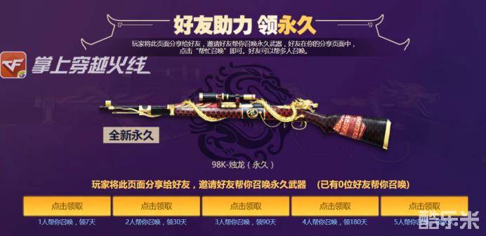 接下来到了我们所熟悉的邀请好友版块,本次可是分为了好友助力和好友登录两大部分!前者为我们首发了永久期限的98K-烛龙,其也算是满足了不少狙击大神在近段时间的一个小心愿。需要注意的是,我们可以为不同的好友进行助力喔~而好友登录版块则是再次放出了永久期限的血影、奢华白银名片等等。具体规则与往期并无太大差异,之前错过它们的小伙伴可以借助本次机会查漏补缺~