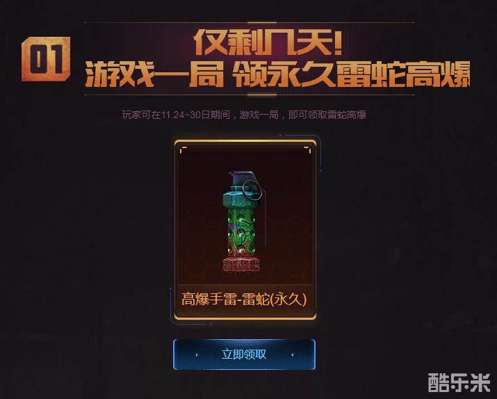 少部分玩家的内心一定是这样想的:这个高爆既然是小香瓜的特效,那也没什么好的啊,所以就不领了!殊不知在本次更新后高爆手雷-雷蛇的特效改为了高爆手雷-SS的特效,这也就意味着官方变向送出了高爆手雷-SS的皮肤版,而且不下3次。