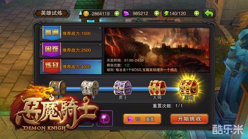 英雄试炼分为三个难度:普通,困难和炼狱。不同难度会有相对应的战力挑战提示,玩家可以按照自己的战力与提示相对照选择挑战的难度。
