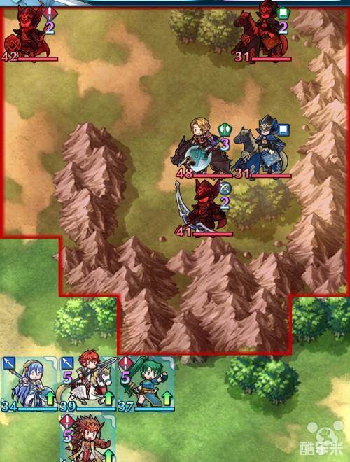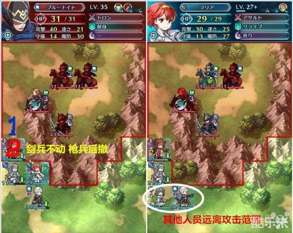 ③ 进战的第一回合,我方枪兵扛住敌人弓箭手,并且反击干掉敌方红剑。同时 BOSS、绿魔都会往左移动,而蓝魔因为移动力和地形关系,暂时堵在比较后面的位置。