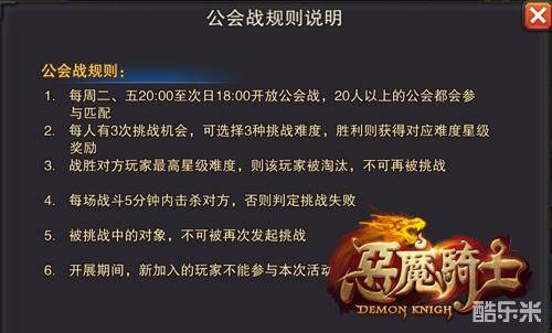 系统依据公会战力总和排行数据,进行自行匹配实力相当的对战公会,战斗场景使用单人竞技对战场景。公会战力总和排名第1的公会开始,20个成员以上的公会,每6个公会一组,组内公会随机匹配,最后一组公会数为奇数时,剩余公会中战力最高的替补进行匹配。